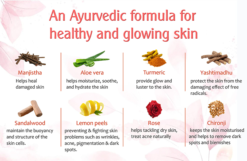 Haldi, Manjishtha, Chandan, Aloe Gel, Lemon Peel, Yastimadhu, Chironji, Gulab Phool, Honey.